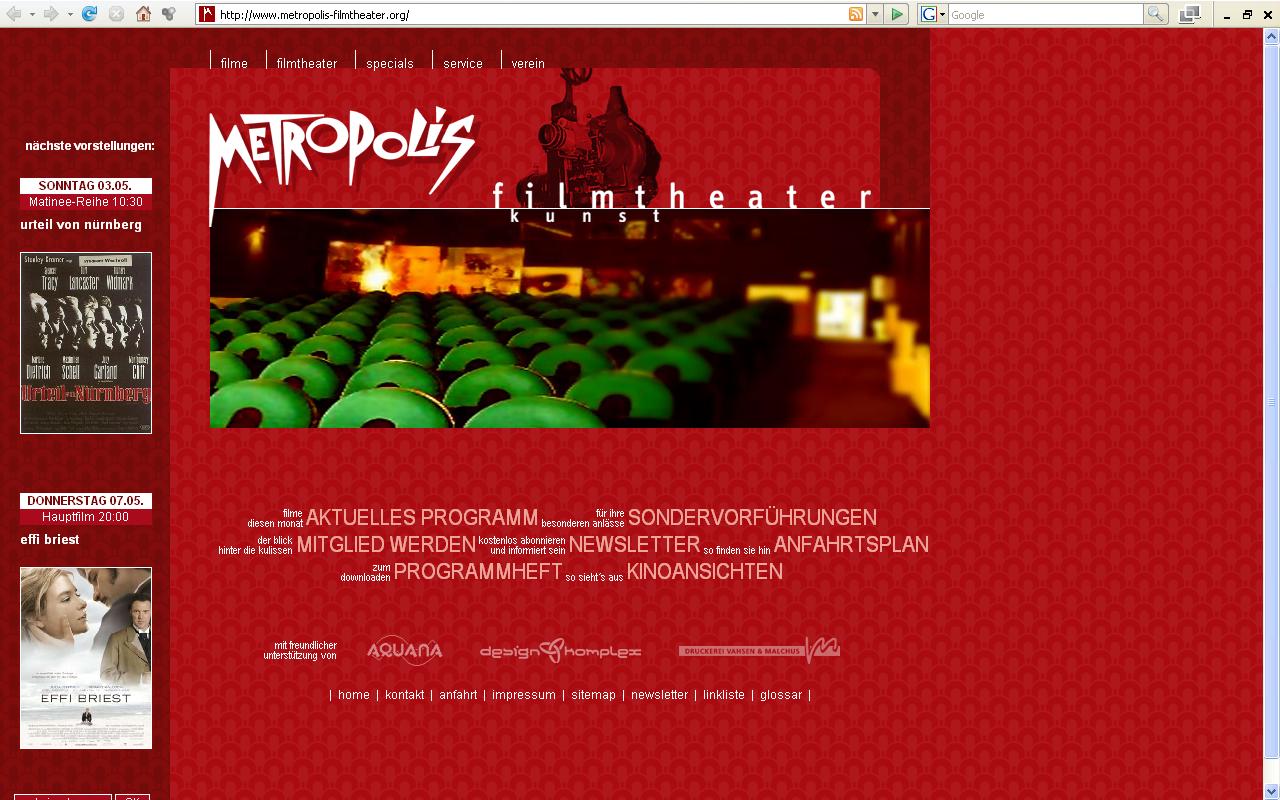 Im kleinen schnuckeligen Metropolis Filmtheater läuft derzeit neben dem Hauptprogramm mit aktuellen Filmen auch wieder eine kleine Matinée. An jedem ersten Sonntag in den Monaten März bis Juni werden wieder Filme einer Themenreihe präsentiert, vorab eingeleitet mit kleinen Vorträgen zu Filmhintergründen und -geschichten. In den Pausen gibt es ein reichhaltiges und liebevoll gestaltetes Frühstsücksbuffet.Die Themenreihe im Frühjahr 2009: „Gerichtsfilme“. Gezeigt werden die Filme „Stammheim“, „Wer den Wind säht“, „Das Urteil von Nürnberg“ und am 07. Juni: „Der Totmacher“.