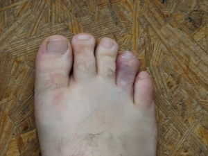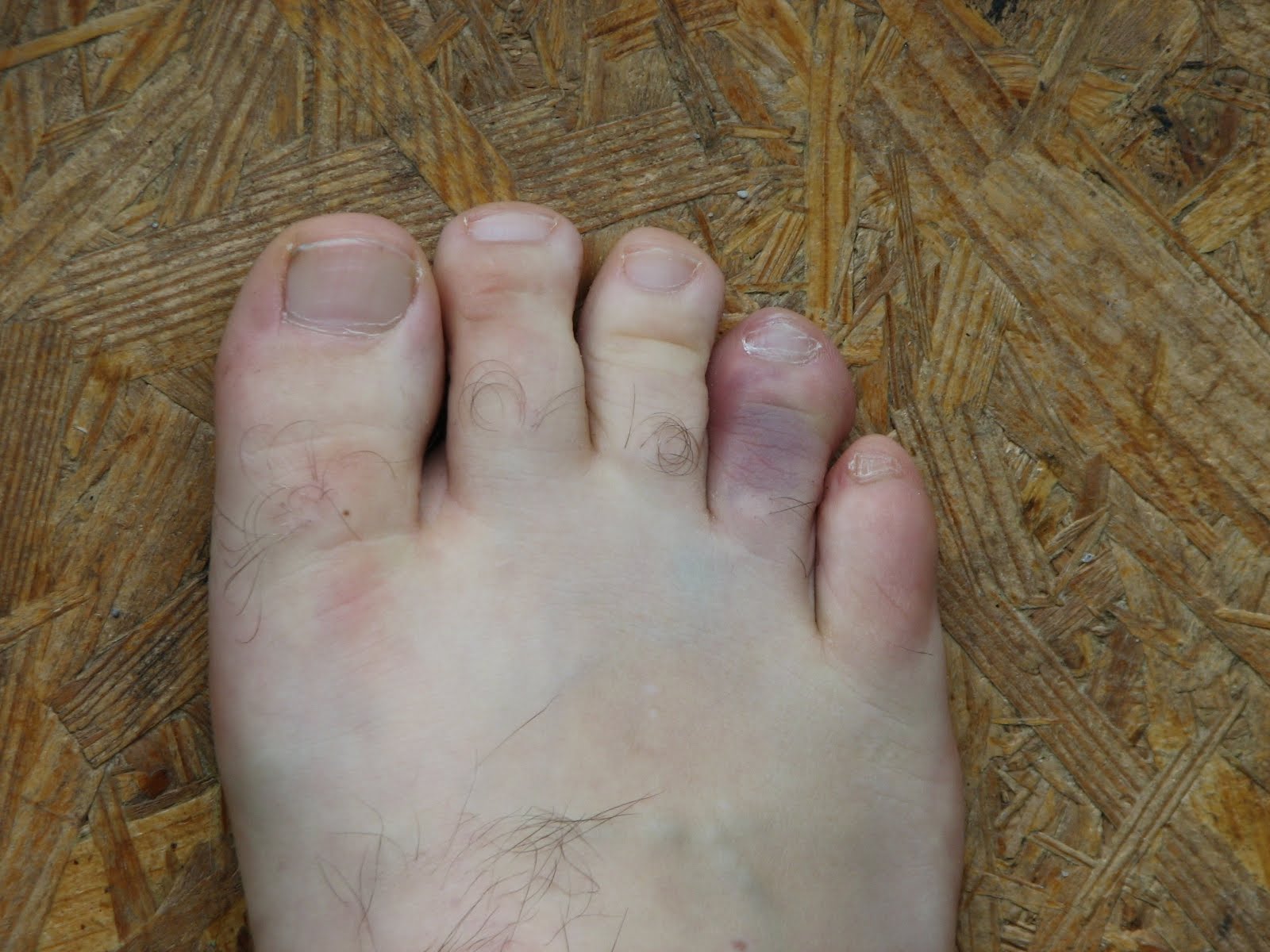 Wieder bei Sinnen fällt es mir genau das auch wieder ein. Zu spät. Der Interessenkonflikt zwischen dem rechten vorderen Fuß des Sofas und meinem rechten Fuß ließ sich nicht mehr kollisionlos vermeiden. Insbesondere digitus IV nimmt sichtlich und spürbar Schaden. Erst bei Tageslicht zeigt sich die Auswirkung des ungleichen Duells der Füße.