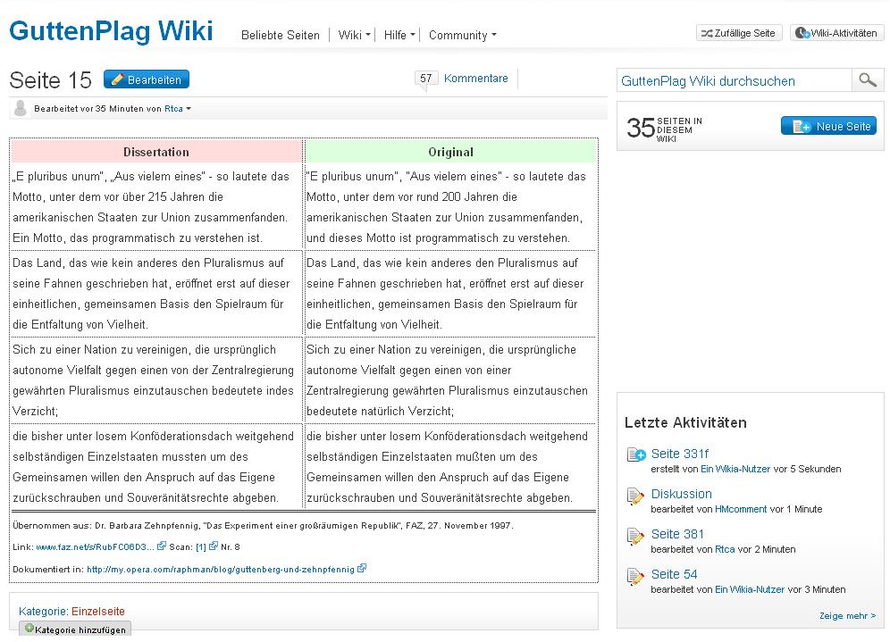 Der Jagdinstinkt in der digitalen Welt ist unerbittlich. Nach Wikileaks und Openleaks nun GuttenPlag Wiki. Wer dahinter steckt ist (mir) nicht klar. Fest steht, jeder ist eingeladen, Plagiate in der Doktorarbeit aufzudecken und zu dokumentieren. Und es machen viele mit. Das sieht dann z.B. so aus:
