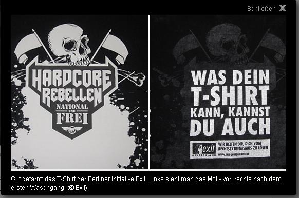 Da greift der gemeine Nazi gerne zu, wenn man ihm eine bedruckte Trikotage schenkt. Vor allem wenn dann noch „Hardcore Rebellen – National und Frei“ in großen Lettern darauf prangt. Rund 250 dieser Leibchen gab es für die Besucher/innen eines Rechtsrock Konzertes in Gera. Der NPD Landesverband nahm das auf den ersten Blick „szenetypische“ Geschenk gerne an. Verdacht schöpfte er nicht. Denn das generöse Geschenk kam von der Neonazi-Aussteiger-Initiative „Exit-Deutschland“. Wohl verbunden mit besten Grüßen zum Fest…