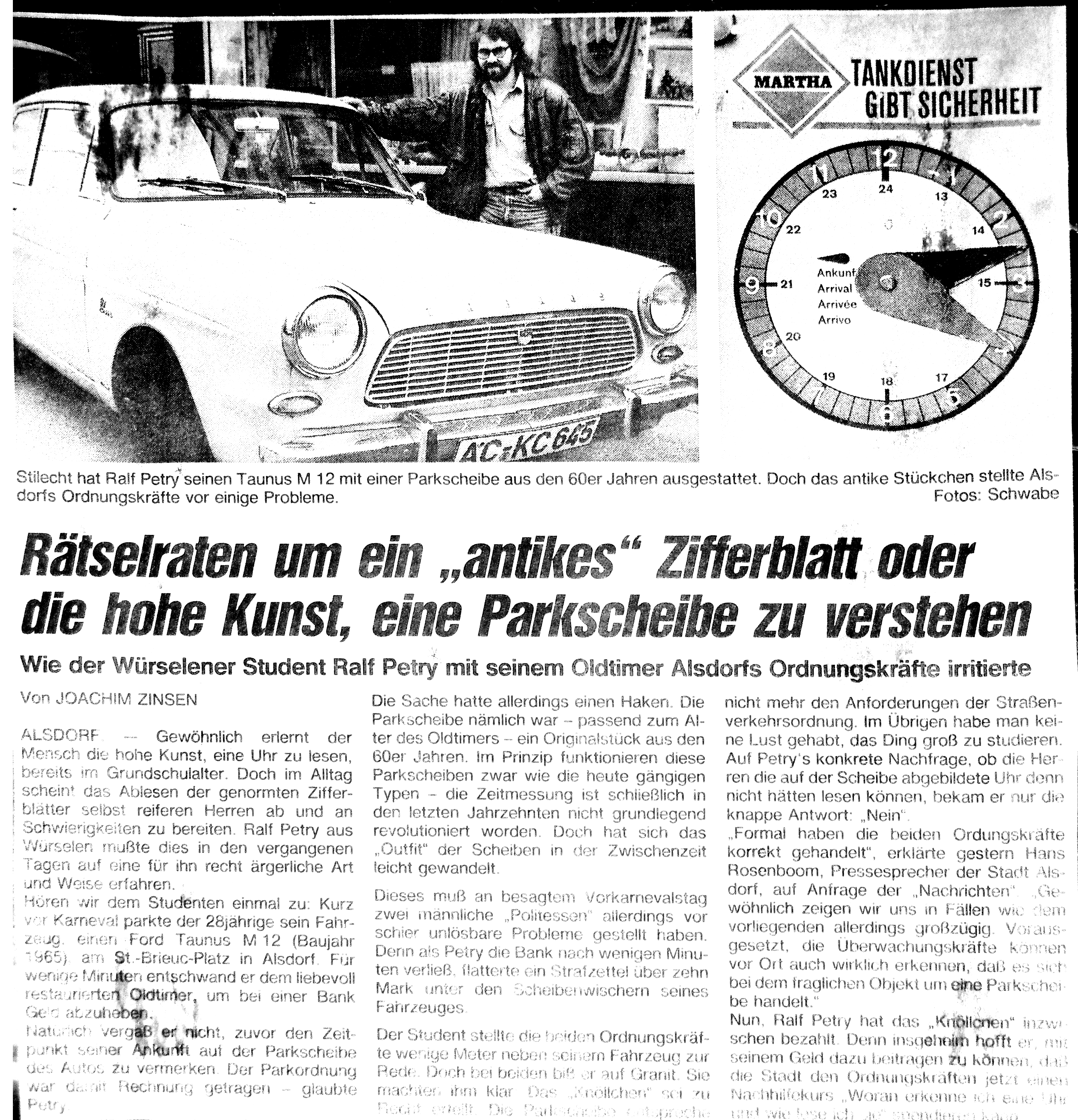 Also, ich war´s. Die Deck- und Gesichtsbehaarung sind zwischenzeitlich kürzer und mein guter alter Ford Taunus nebst Martha Tankdienst Parkscheibe befindet sich mittlerweile im Besitz von Alexander, Chef und Webmaster von taunus-p4.eu. Und der benutzt nur korrekte Parkscheiben…