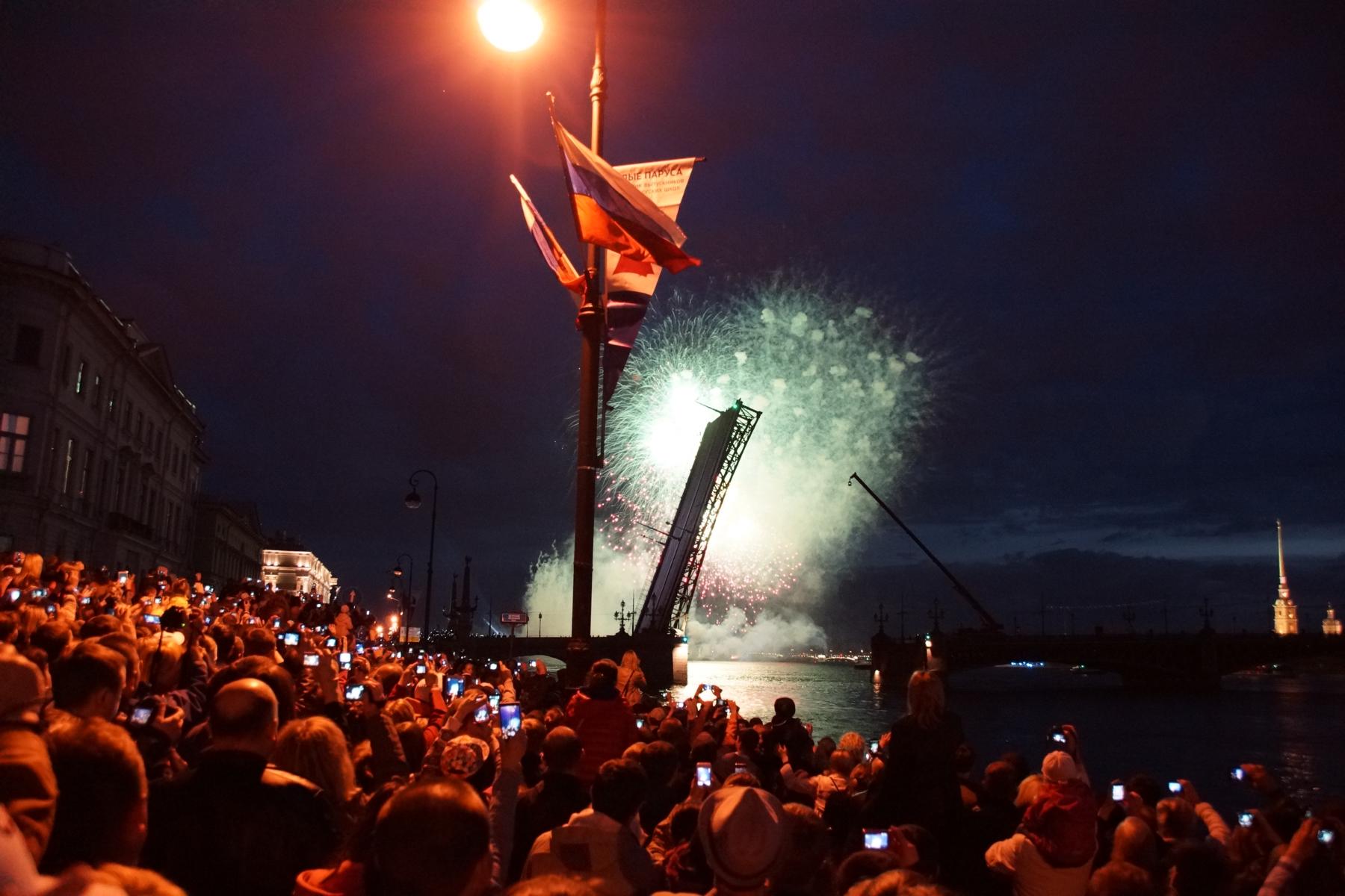 Höhepunkt des Erlebnisses „Masse Mensch“ war die „Nacht des scharlachroten Segels“. Wie man lesen kann angeblich „die größte Feier von Schulabsolventen in St. Petersburg und vielleicht sogar in ganz Russland. Die aufwendig inszenierte Mega-Show findet Mitte Juni zur Zeit der Weißen Nächte statt und wird im russischen Fernsehen live übertragen. Die „Scharlachroten Segel“ sind ein Aushängeschild von St. Petersburg und ein wahrer Touristenmagnet, der jedes Jahr Millionen von Besuchern anzieht. Menschen aus Russland und dem Ausland reisen speziell um diese Zeit nach St. Petersburg, um diese einzigartige Show live zu erleben.“