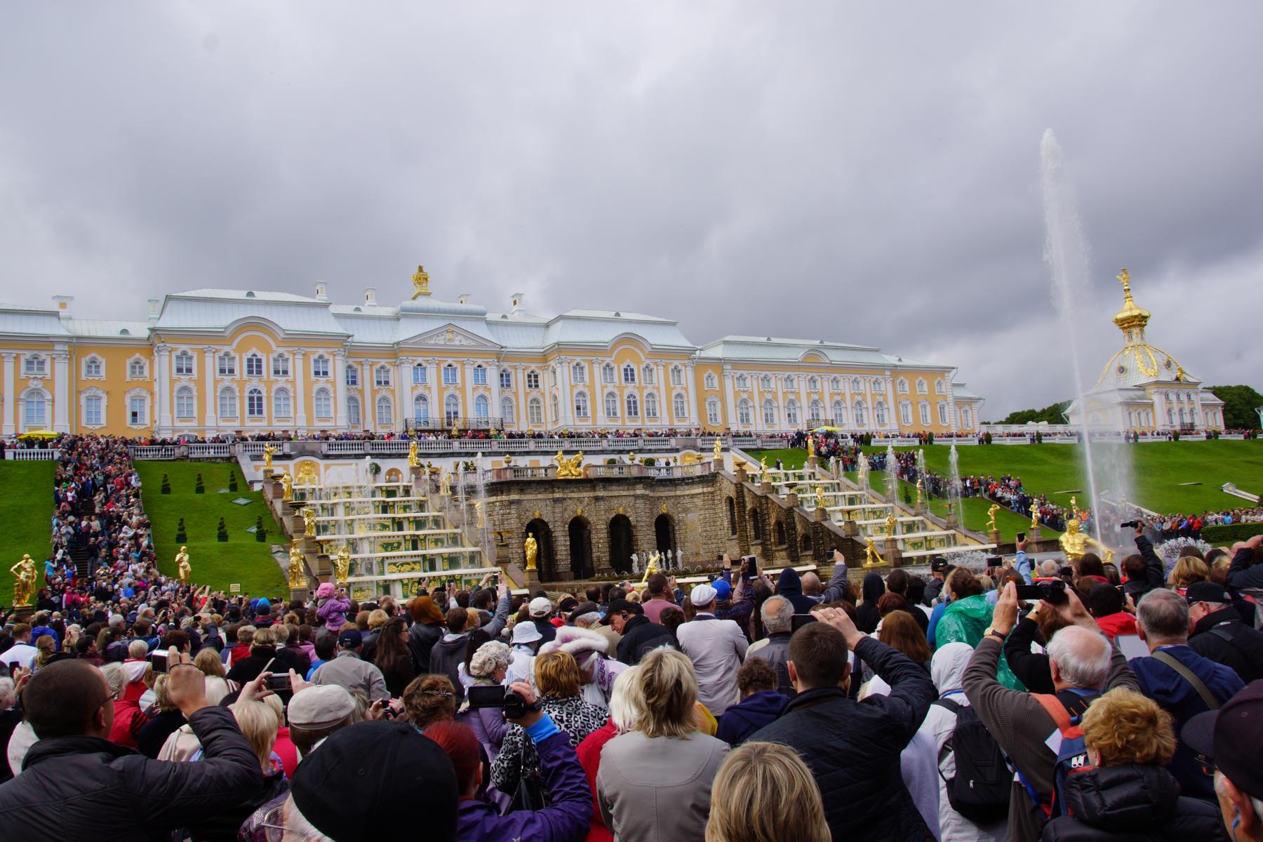 Am Schloss Peterhof gibt es eine große Parkanlage mit Springbrunnen, ähnlich wie in Versailles. Direkt hinter dem Hauptgebäude befindet sich so eine Sprinkleranlage die zu gewissen Uhrzeiten mit Pomp und Pathos musikalisch unterlegt sukzessive anfängt rumzuspritzen. Diesem einmaligen Schauspiel wohnen dann hunderte (wenn nicht tausende) von Spritzwasserbegeisterten bei. Maximal 10 Minuten piff paff puff, rabbelte kapääss, inmitten von Gedränge und festgehalten von digitalen Massespeichern. Übrigens, allerliebst sind mir die, die gleich ihr ganzen Tablet in die Luft halten… Herrlich.