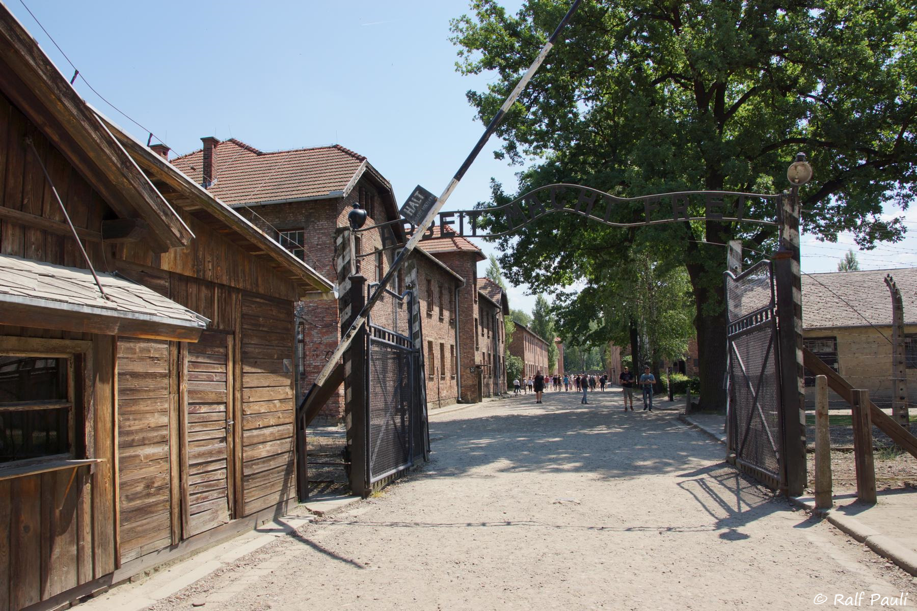 Und nun standen wir vor dem berühmten Eingang des KZs, mit seinem Banner „Arbeit macht frei“. Und während die junge Museumsführerin in arg zügigem Tempo durch die Räume, engen Keller und dem weitläufigen Gelände zog, mit vielen Erklärungen zu Geschichte und den Verlauf dessen, was sich just an diesen Orten ab ca. 1940 vollzogen hatte, versuchte ich einen inneren Bezug dazu herzustellen. Als derjenige in unserer Gruppe, der Fotos zur Dokumentation unserer Reise machen sollte, hing ich immer etwas hinterher und versuchte mich in Muße, den Ort für mich zu verinnerlichen. Reichlich Fotos habe ich gemacht, wobei ich mich im Inneren der Gebäude maximal zurück gehalten habe. Die Ausstellungsstücke von Massen an Schuhen, Haaren (!), Brillen, Töpfe und weiterer Überreste wollte ich nicht digital festhalten. Einiges war ohnehin nicht erlaubt.