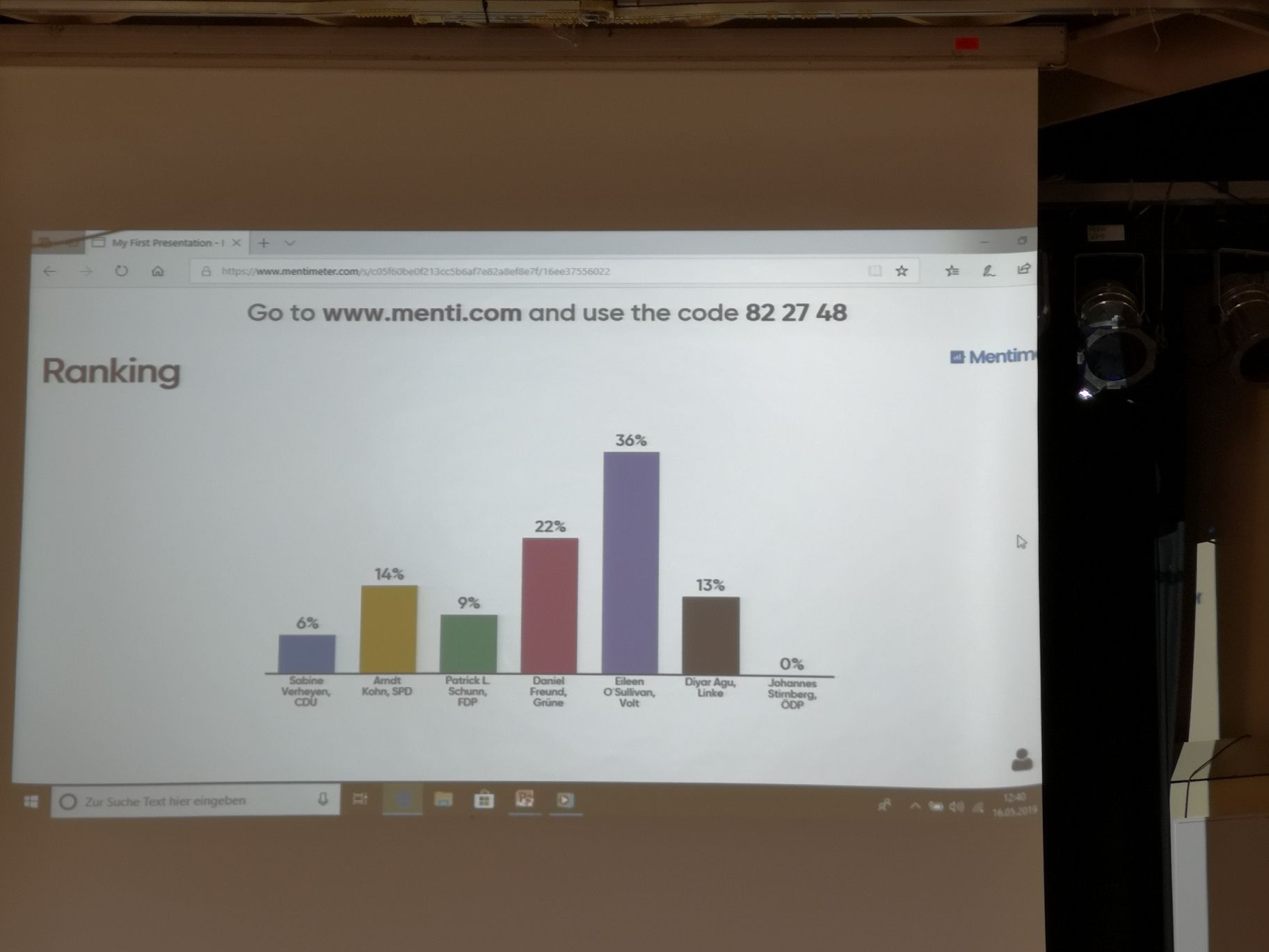 Der Veranstaltung voran ging ein anonymes Live-Voting, bei dem die jungen Leute vorab ihre Präferenzen hinsichtlich der zu wählenden Partei abgeben konnten. Dasselbe wurde am Ende aller Frage-Antwort-Runden noch einmal abgehalten mit einem für alle wohl überraschendem, weil völlig anderem Ergebnis. Da ich zu spät kam, habe ich das erste Voting nicht miterlebt. Am Ende gab es ein für alle überraschendes, deutliches Votum zugunsten der noch jungen Europapartei „VOLT“.
