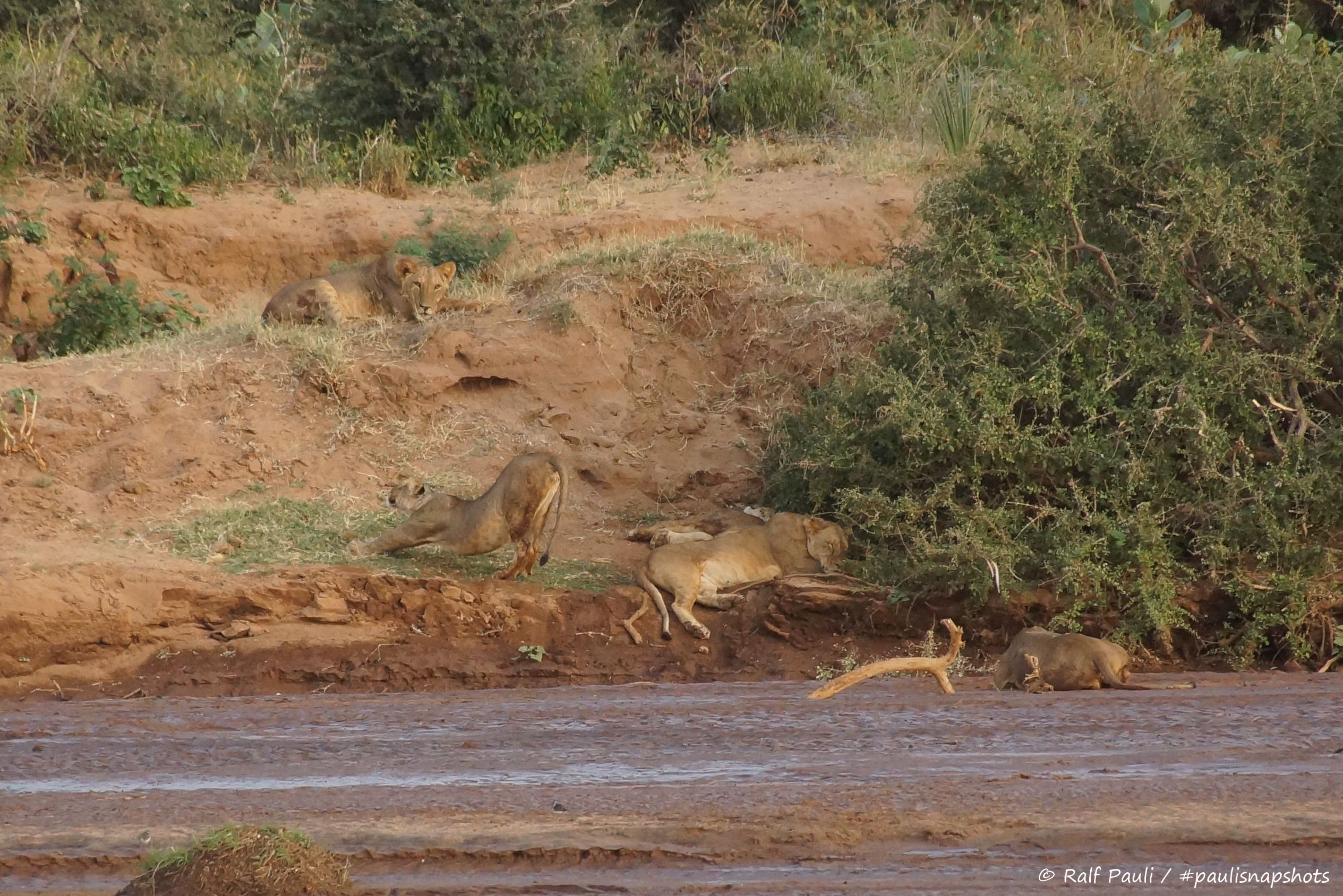 Wir haben sie gesehen! Schon am ersten Abend lagen sie – zugegeben watt weit weg – aber doch nah genug auf der anderen Seite des fast leeren Flusses: Löwinnen! Fünf an der Zahl!