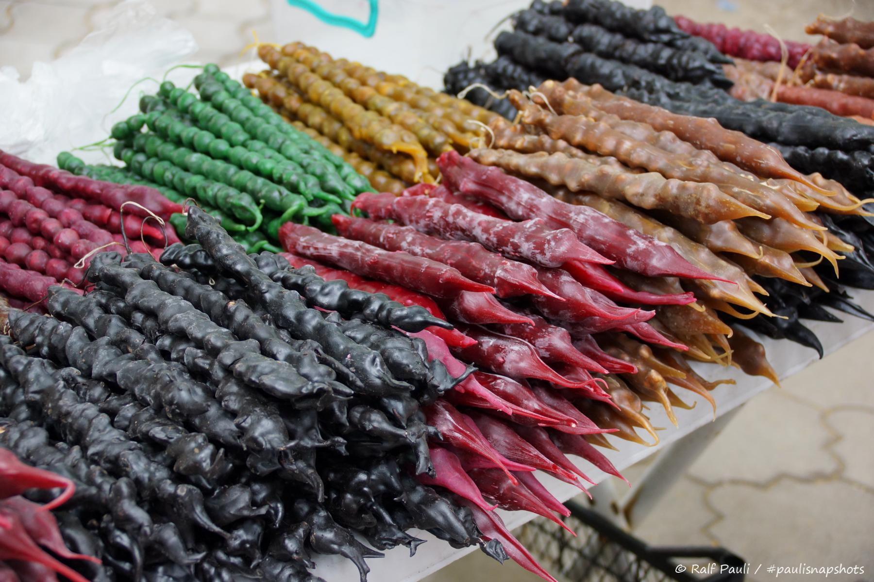 Oder Tschurtschchela: Süßkram den es fast an jeder Ecke zu kaufen gibt. Dabei werden Haselnuss- oder Walnusskerne auf eine Leine gebunden, in Traubensaft getaucht und mit Mais- und Weizenmehl angedickt, bis sich eine dünne Schicht über die Nüsse gelegt hat.