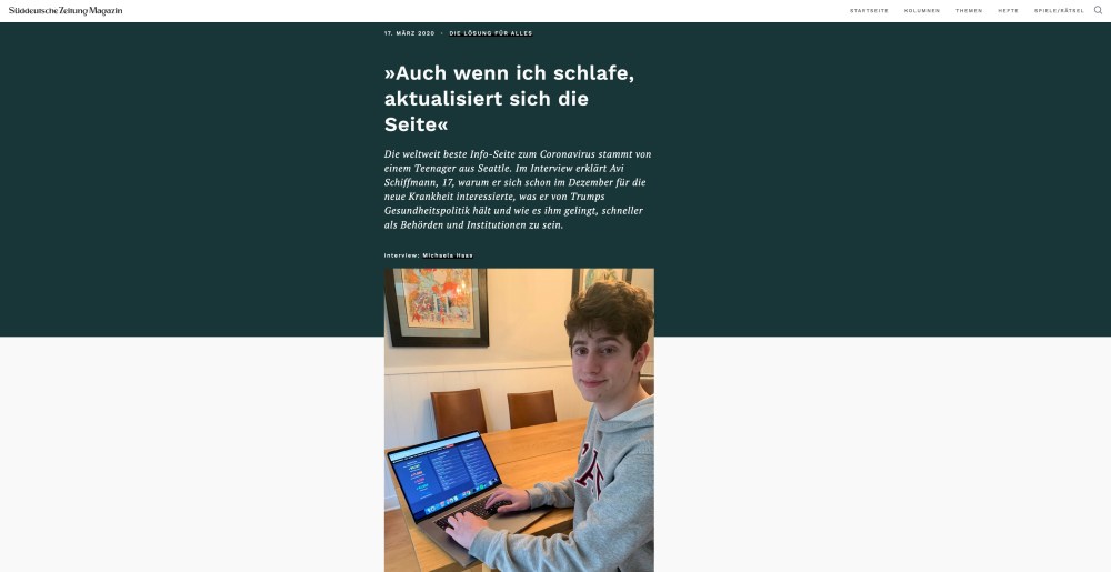 Glaubt man dem Interview von Michaela Haas in der Süddeutschen Zeitung vom 17. März 2020, hat ein 17-jähriger Schüler aus Seattle wohl eine vermeintlich „weltweit beste Info-Seite“ zu den aktuellen Fallzahlen der Corona Krise erstellt.