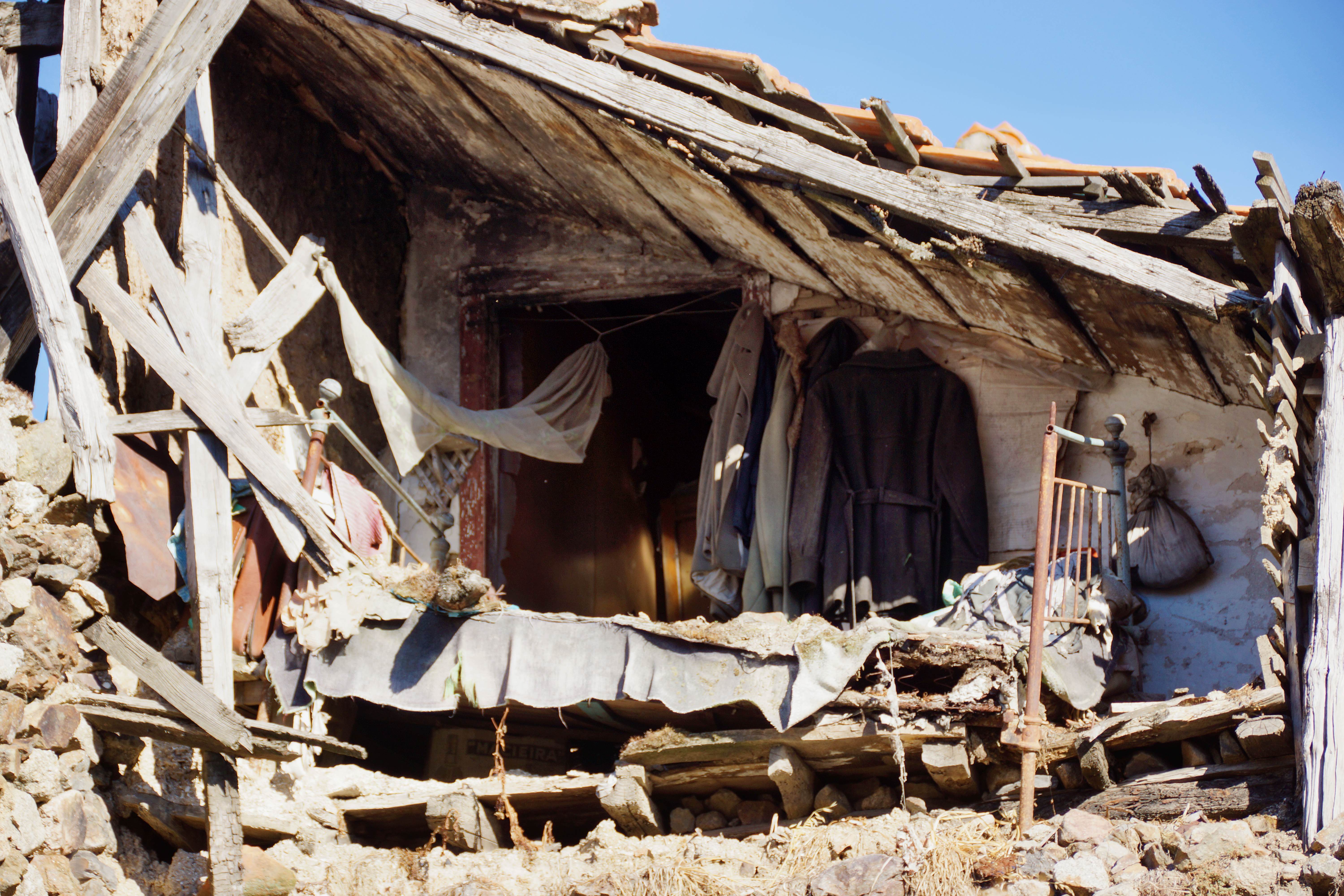 Und doch scheint es so, als ob der (oder die) Bewohner_in dort noch irgendwie zugegen sei. Mäntel und Jacken hängen an der Wand, das Bett alt und rostig mit Matratze steht noch – wenn, auch in Gram gebeugt, darauf Kleidung und Tüten und unter dem Bett ein Pappkarton „Macieira“, dem portugiesischen Brandy, dem auch wir sehr zugetan sind. Und an der Decke hängt noch ein Moskitonetz.