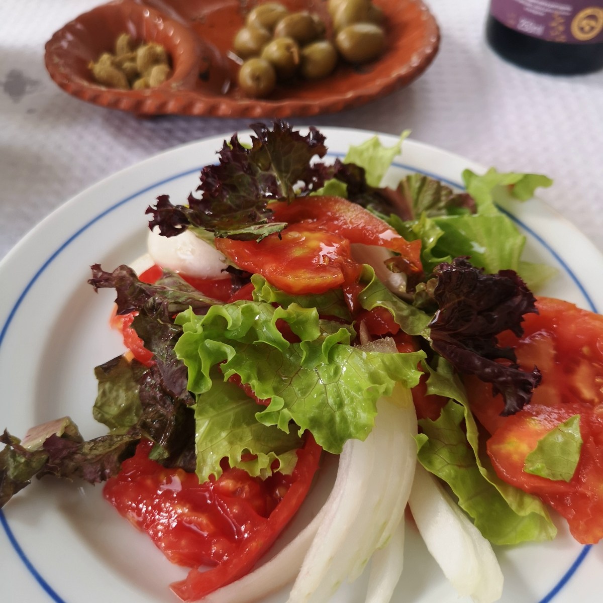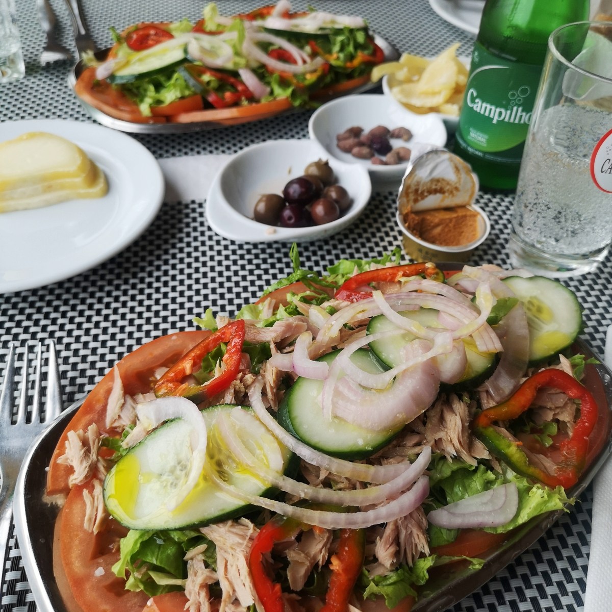 Salate, Gemüse, Fisch, auch watt Fleisch stehen da auf der Menükarte. Wobei letzteres mein Auge weniger erfassen mag. Dazu vor der Vorspeise meist noch ein „Couvert“ mit Brot, Butter und Sardinenpaste sowie ein Schälchen Oliven. Flankiert von einem schönen kleinen kühlen leichten frisch o´zapften Bierchen, „Imperial“ genannt. Oder ein Becherchen mit rotem Weinchen. Zurück nach einem anstrengenden Tag vonne Praia und noch ganz benetzt von Sonne, Salz und Sand, ist das ein herrliches, gleichsam schlichtes Horsd’œuvre.
