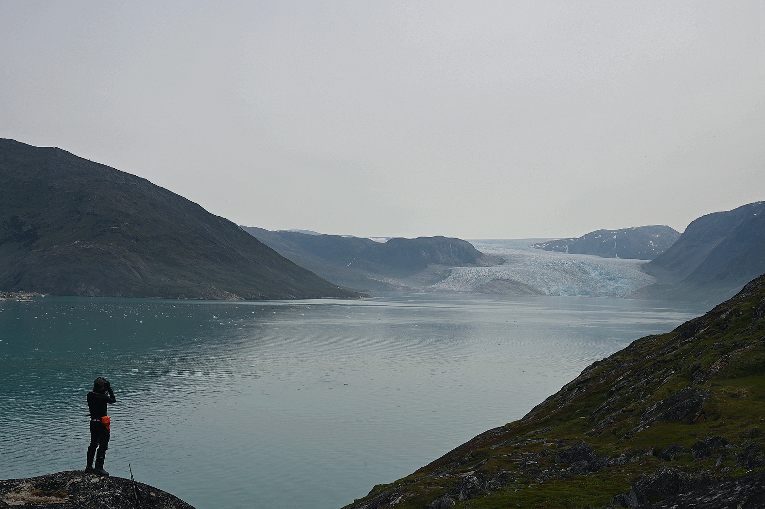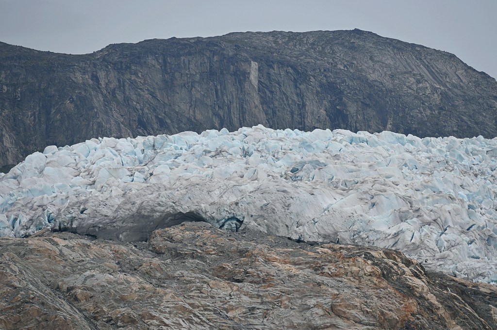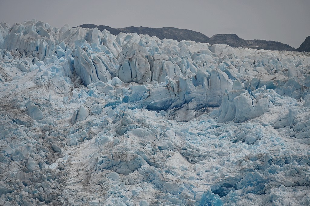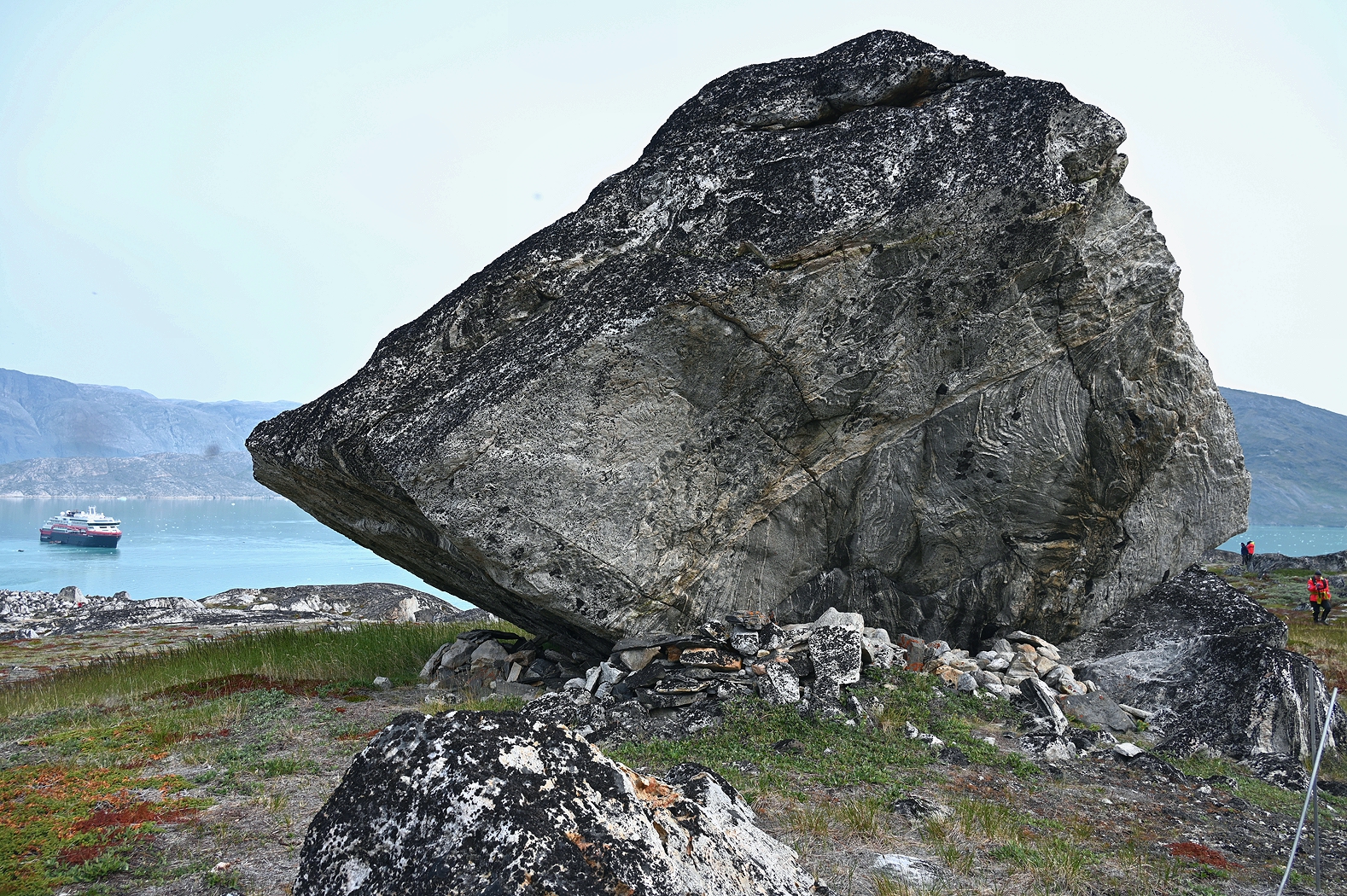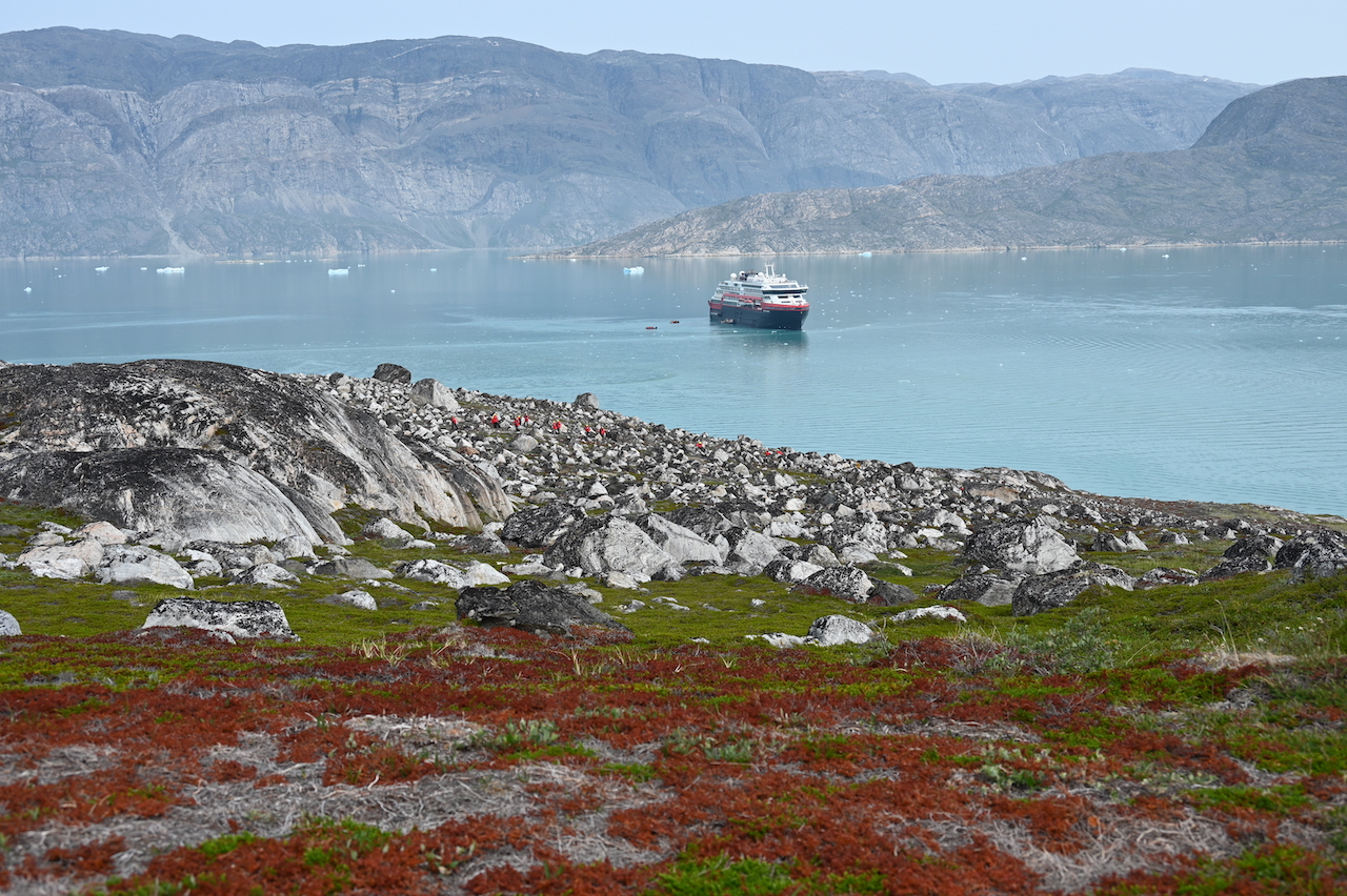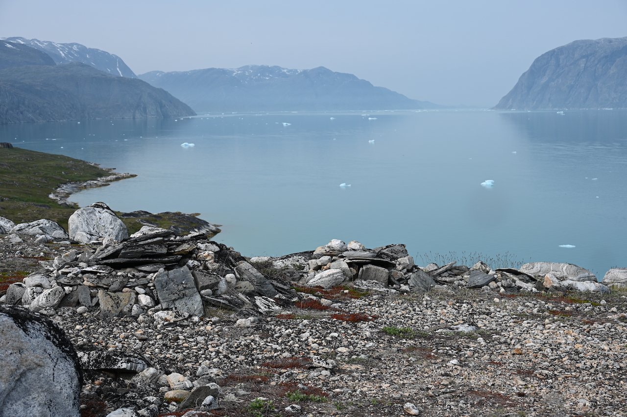 Nächster Stop: der „Kvanefjord“. Der „Ort mit viel Eis“ ist ein fast 50 Kilometer langer Fjord nahe der Kommune Sermersooq. Zwei Besonderheiten ragen heraus, die wir über den Tag nacheinander besuchen konnten. Mit Hilfe von Zodiacs (Schlauchboote für ca. 12 Personen plus Fahrzeugführer) ging es zunächst zu einer Anlandung. Ein kurzer Fußweg führte – in gebührendem Abstand – an sehr alten Gräbern vorbei. Der Fußweg ermöglichte einen großartigen Blick rundherum um den Fjord, an dessen einem Ende ein großer Gletscher zu sehen war. Unser zweites Ziel de Tages, den wir mit dem Zodiac später anfahren sollten.