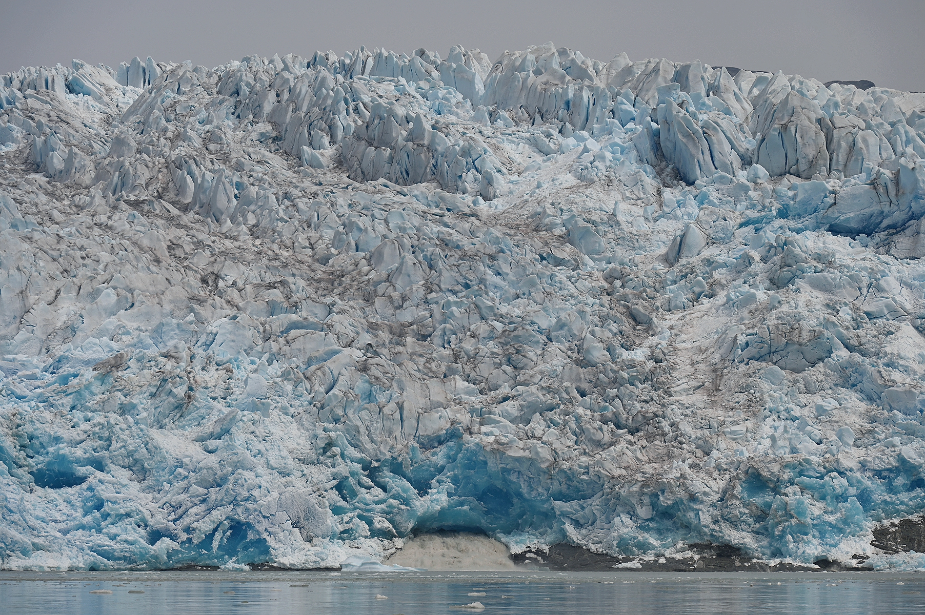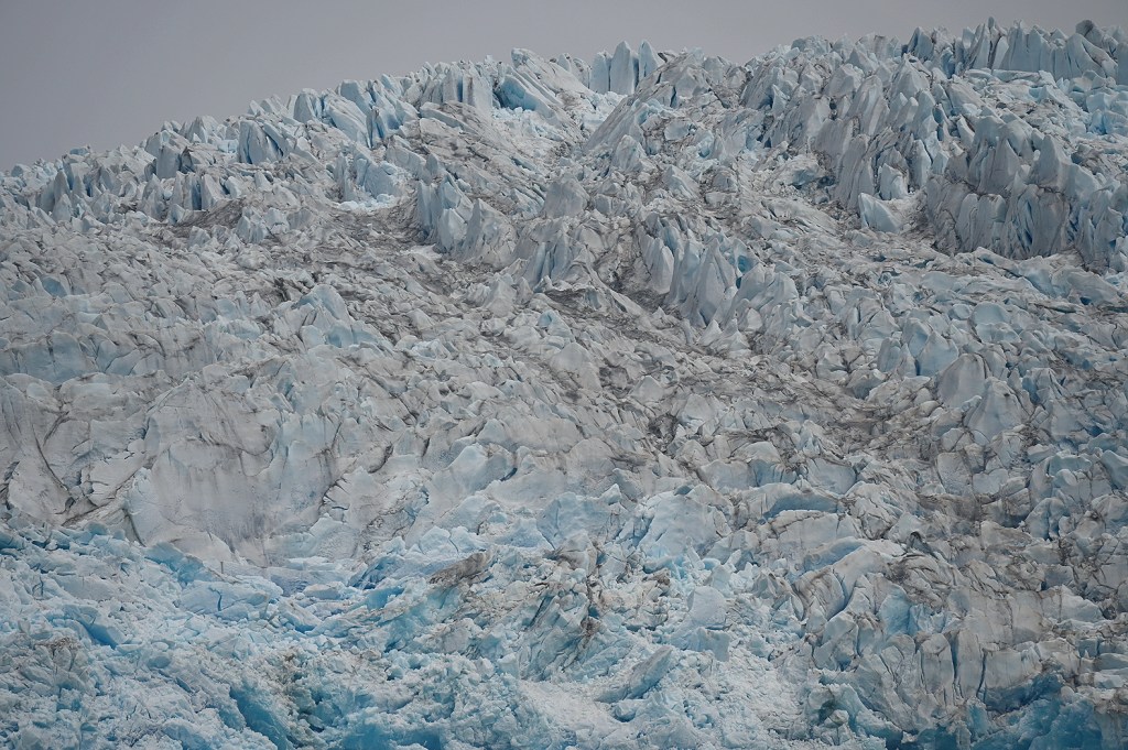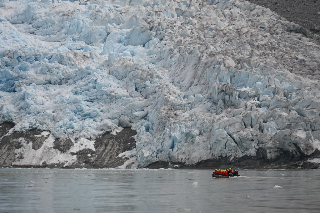 Teil zwei dann also auch für uns die Fahrt zum Gletscher. Im Zodiac. Immer ein großer Spaß so eine Fahrt, vor allem so unmittelbar nah am Wasser gebaut und richtig mittig inne Natur. Und je näher wir dem Eisgiganten kamen, umso imposanter ragte er heraus. In etwa der Mitte schoß Schmelzwasser üppig heraus. Die Dimension lässt sich in Fotos nur erahnen. Absolut beeindruckend!