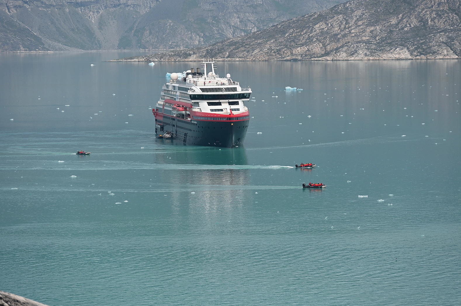 Nachdem sich nun die ersten Erlebnisse auf Grönlands Boden in unser Hirn eingebrannt hatten, schipperte die MS Fridtjof Nansen gemächlich ihren Weg weiter die Westküste der weltweit größten Insel hoch. Immer wieder auf´s neue beeindruckend ist der frühe Morgen an Deck, wenn das Schiff in einen Fjord einfährt. Die Stille, die Kälte, das noch diffuse Licht – irgendwie schwer in Worte zu beschreiben. Aber die wenigen, die sich in der Frühe aufmachten um den Tagesbeginn just dort oben zu erleben, schwiegen andächtig und schauten dem langsamen Dahingleiten des Schiffes zu. Das sagt alles.