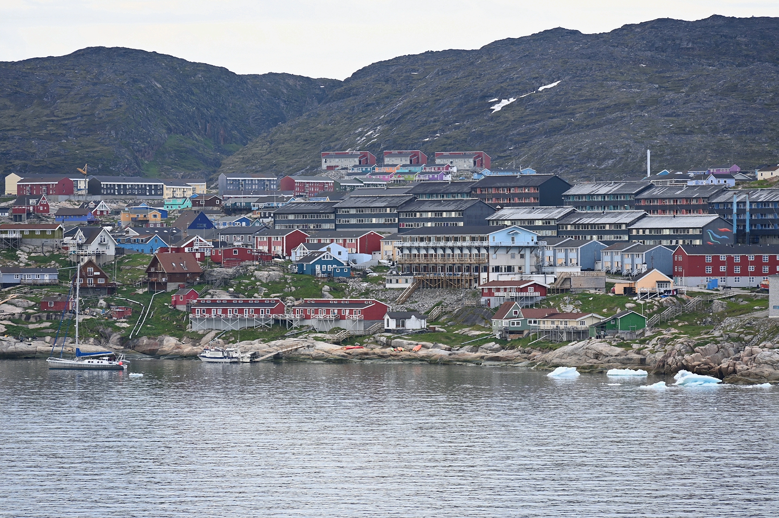 Ilulissat also. Die Einfahrt vor dem Hafen ermöglichte wieder einen Blick auf das Städtchen. Und wie schon zuvor an den anderen Bebauungen zu sehen, bot sich wieder ein sehr buntes Bild.
