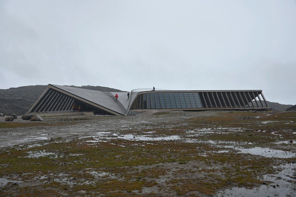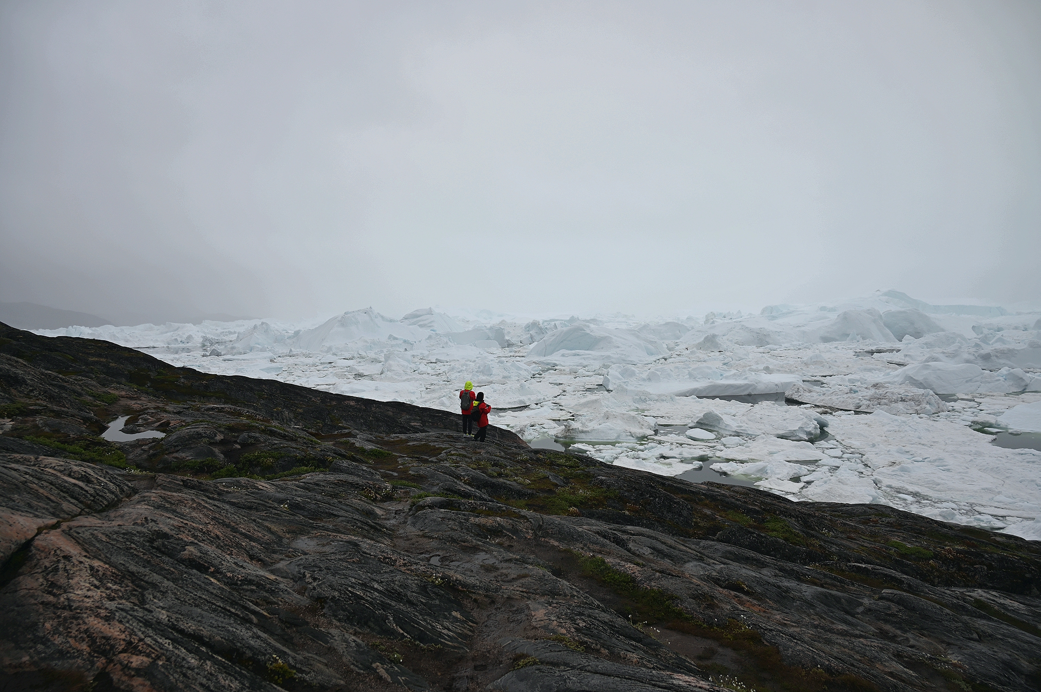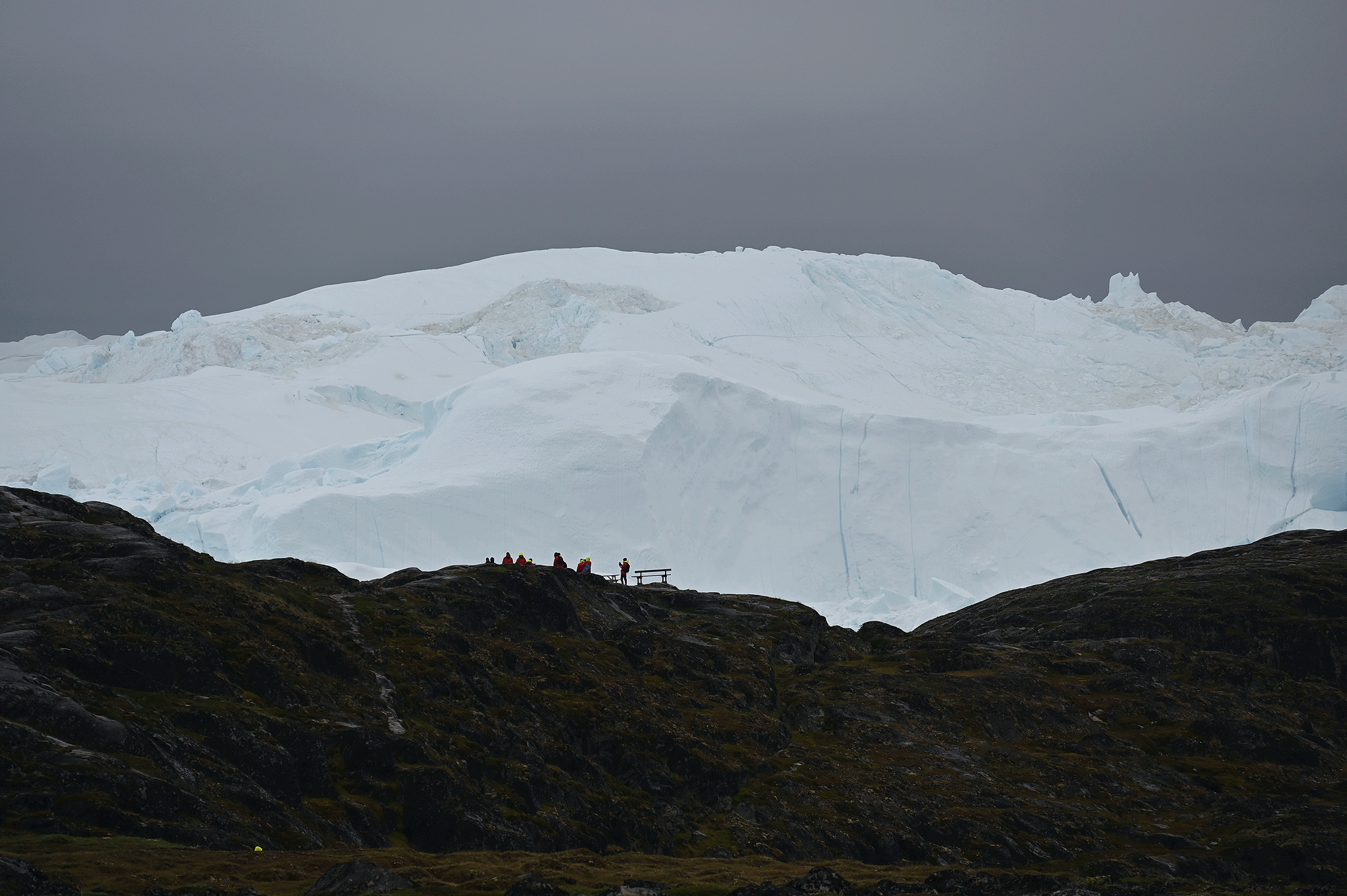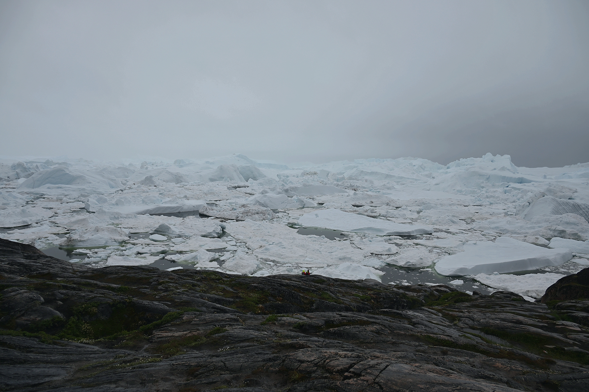 Nun, es kam noch der obligatorische Landgang. Zuerst mit dem Bus zum Ilulissat Eisfjord-Center. Von dort auf dem Holzweg zu einer allseits empfohlenen Aussichtsstelle. Versprochen war der Blick auf den Ilulissat Eisfjord.