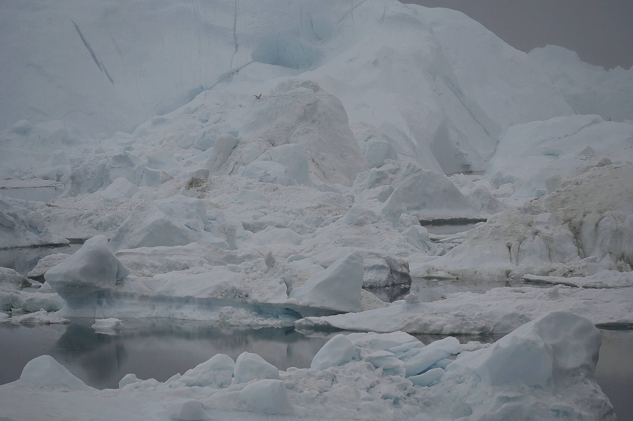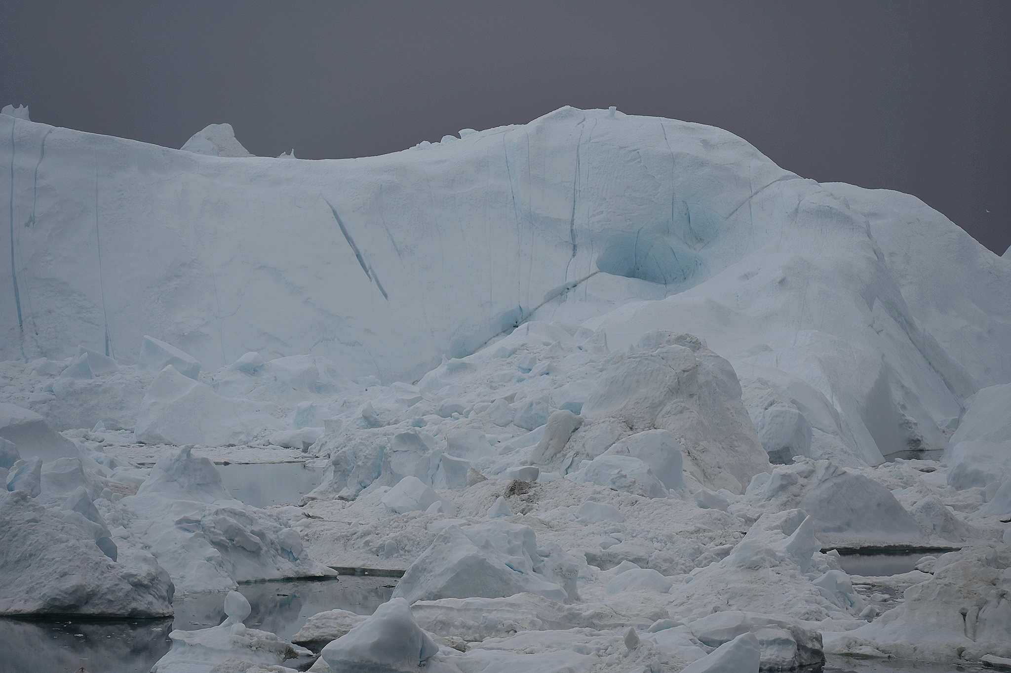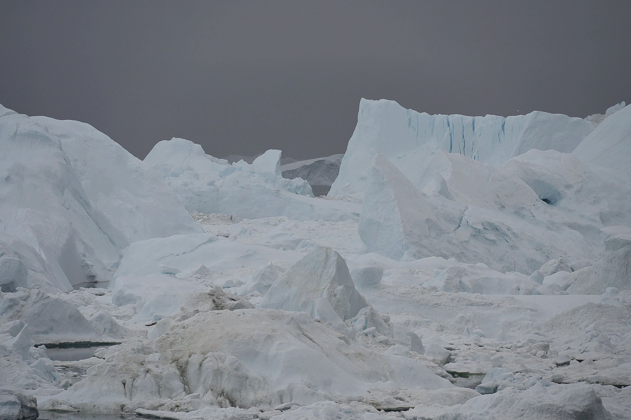 Und während die Gattin den Heimweg antrat, stapfte ich wie entfesselt zurück zum Ort des Geschehens. Um wieder fast andächtig auf das zu blicken, was sich mir da bot. Mag sein, dass das lyrisch arg prosaisch daher kommt. Aber all die Lyrik, oder selbst die ausgesuchten Fotos können kein vollständiges Bild, nicht die Atmosphäre und Stimmung am Ilulissat Eisfjord ansatzweise beschreiben.