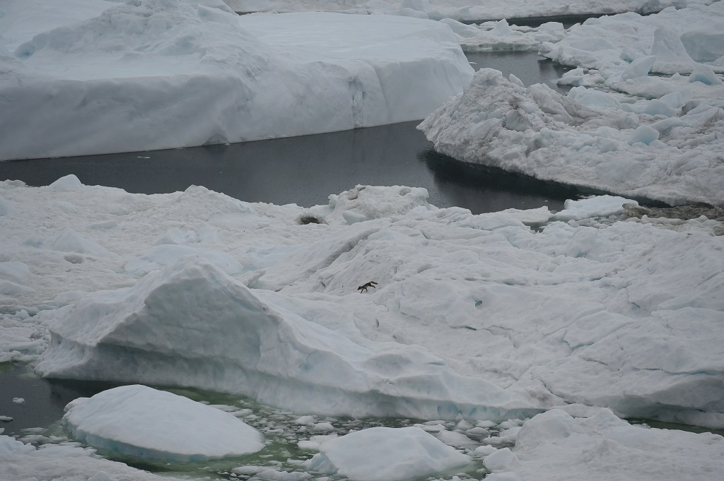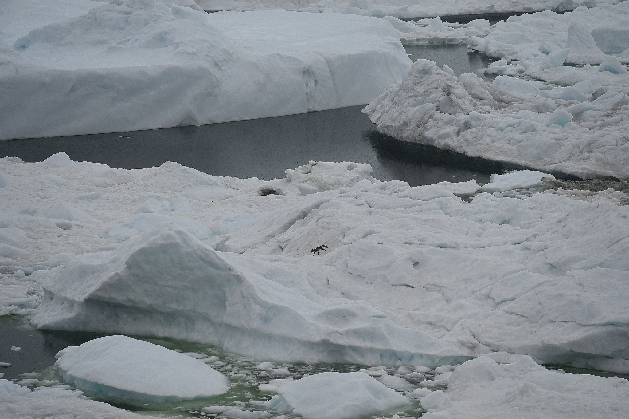 Joh, und während ich noch fast anderthalb Stunden dort umher kraxelte und in Ehrfurcht rum verweilte, erblickte ich mittendrin auch noch einen Polarfuchs auf Wanderschaft. Der tauchte plötzlich auf, lief von rechts nach links über die weißen Felder und verschwand irgendwann auf Nimmerwiedersehen.
